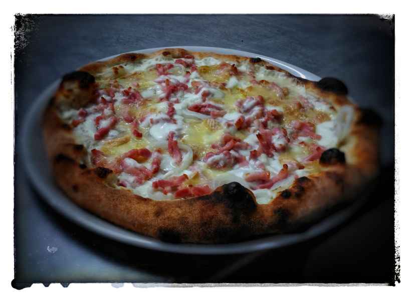 Crème fraîche, mozzarella, oignons, munster, lard, pommes de terre.